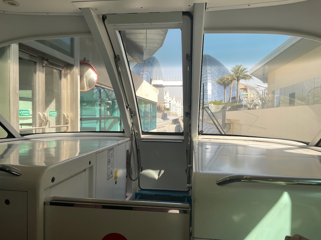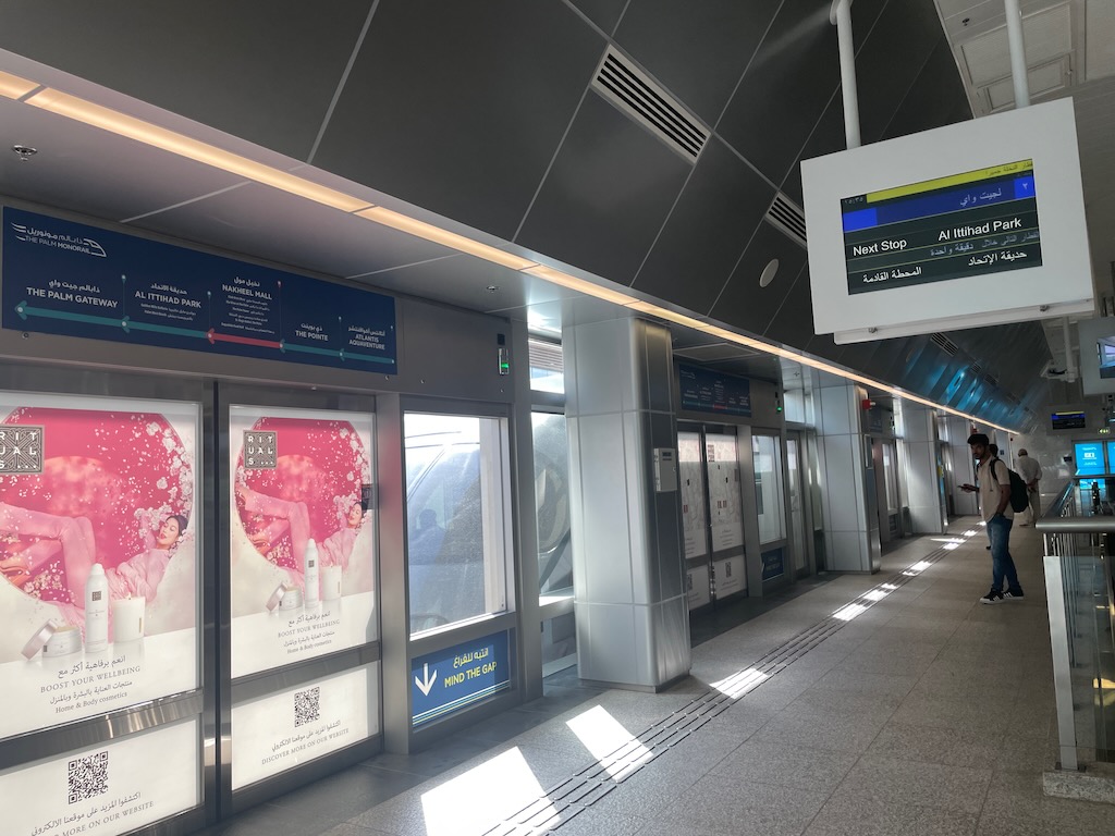 O monotrilho roda só pela área da Palm Jumeirah (o arquipélago em formato de palmeira), em embora seja uma linha pequena (são cerca de 5 km) vale pelo visual: o trem não tem motorista e passa sobre o Golfo Pérsico. O trem começa na estação Palm Gateway e vai até o Atlantis Aquaventure Waterpark.