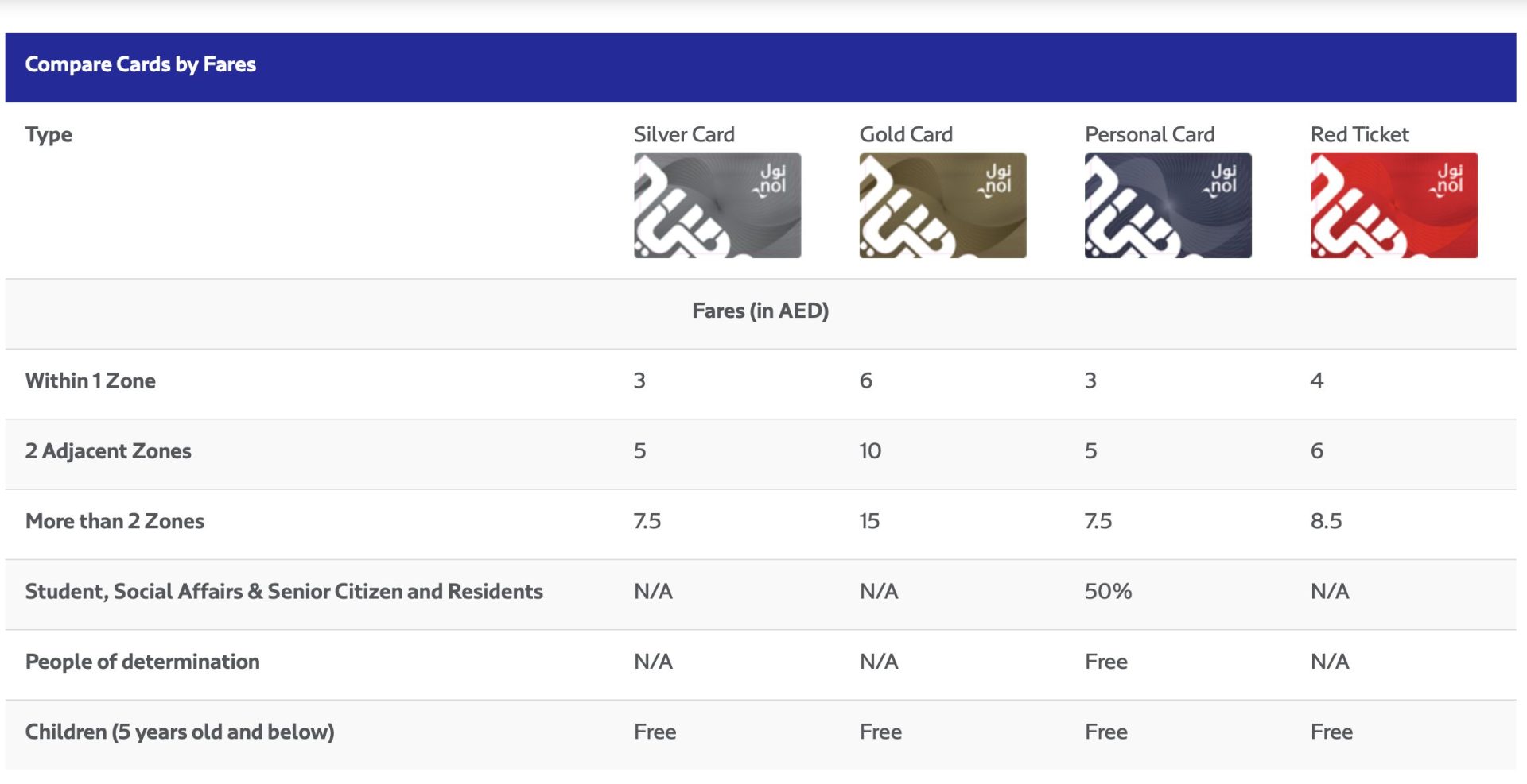 O cartão vermelho custa 2 AED e você pode recarregar para no máximo dez viagens. Já o Silver custa 25 AED e inclui 19 AED de saldo. O Nol Gold Card custa o mesmo que o prateado, mas permite andar nos vagões gold e a passagem é mais cara. Já o personal card é indicado para residentes.