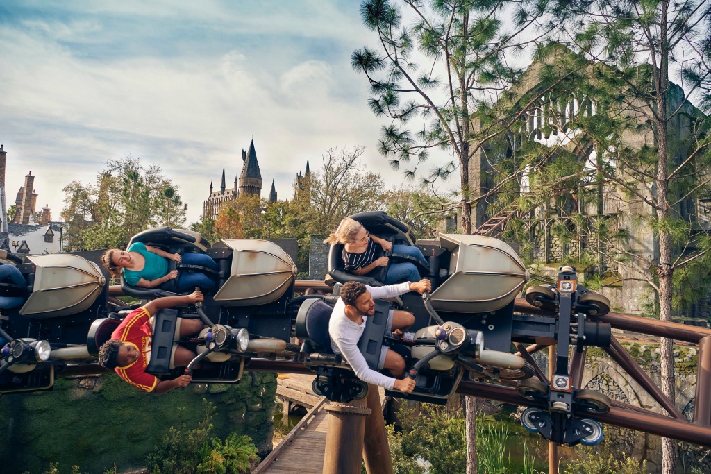 O castelo de Hogwarts pode ser visto de longe, e a dica é direto para lá já que a fila é grande. Ainda assim não dá para cansar tanto na fila porque ela já é um verdadeiro passeio pelo castelo: há os quadros que se mexem, a sala da Grifinória, o chapéu seletor… os fãs vão reconhecer tudo. Quando chegar a sua vez, você vai entrar em um carrinho que o fará voar por Hogwarts. O brinquedo mistura telas de cinema com tecnologia 3D vistos por um carrinho que se move para recriar várias cenas de Hogwarts.