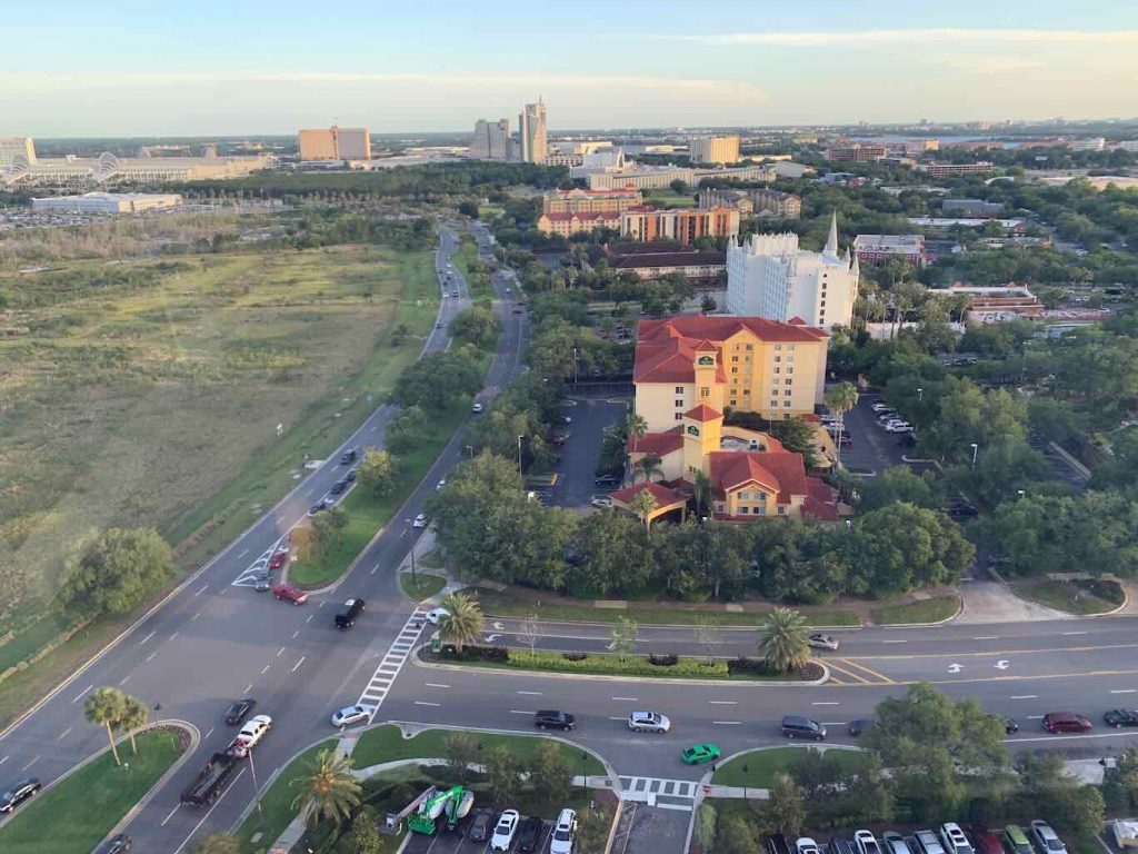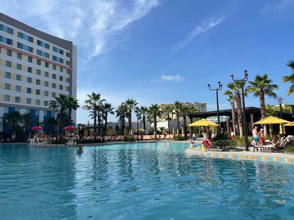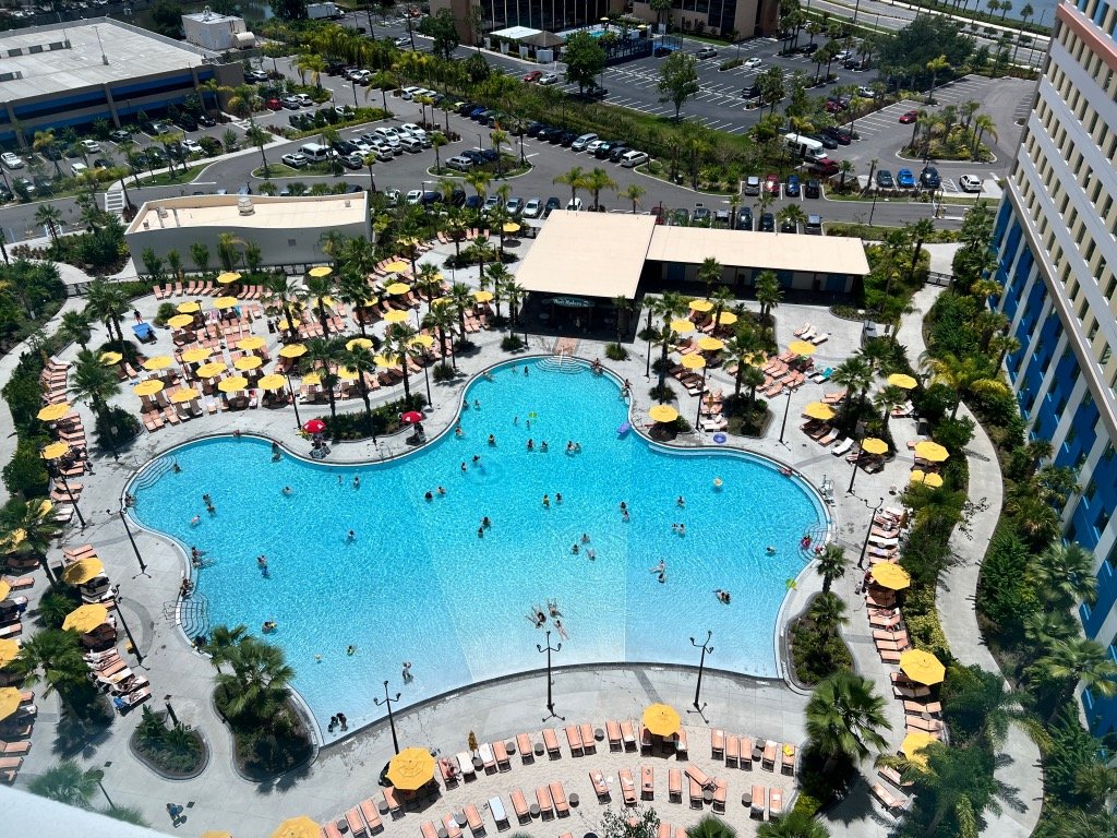 Quando as crianças – ou os adultos – precisam dar um descanso dos parques, o hotel faz bem essa função. Afinal, conta com uma piscina grande, que no verão é agitada especialmente de noite quando o calor ainda é forte. O edifício tem dez andares, e o ideal é pegar um andar alto com vista para a piscina. Você verá não só ela, como todo o horizonte de Orlando na janelona do quarto. Do outro lado, as suítes podem ter vista para o lago ou para o estacionamento.